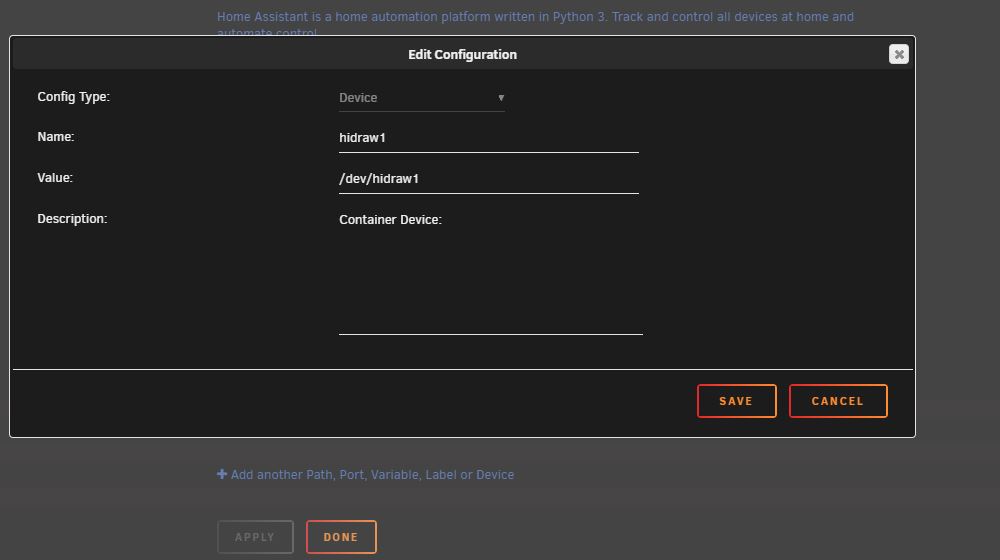 Click Save, then Done, and the Docker container will be stop and updated with the new pass through. Follow through with adding the hidraw<x>