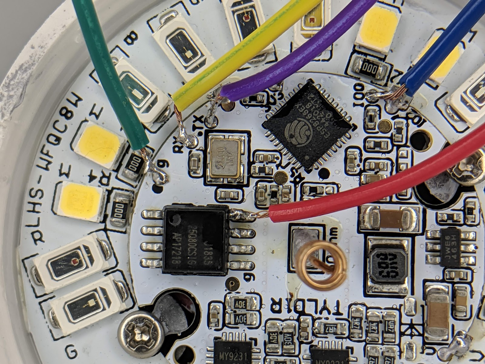 Luckily the quite awesome performance to cost ratio bulbs that Lohas provides they also have the RX/TX pins exposed for us right on top under the diffuser. That's quite rare in a bulb, especially in one of my favorite bulbs! The only issue I've found is the 3v3 pin does not work! But no fear! It is easy to solder to the 3v3 pin on the flash memory chip.