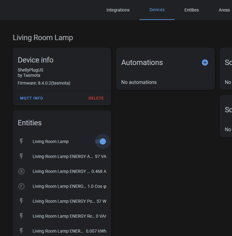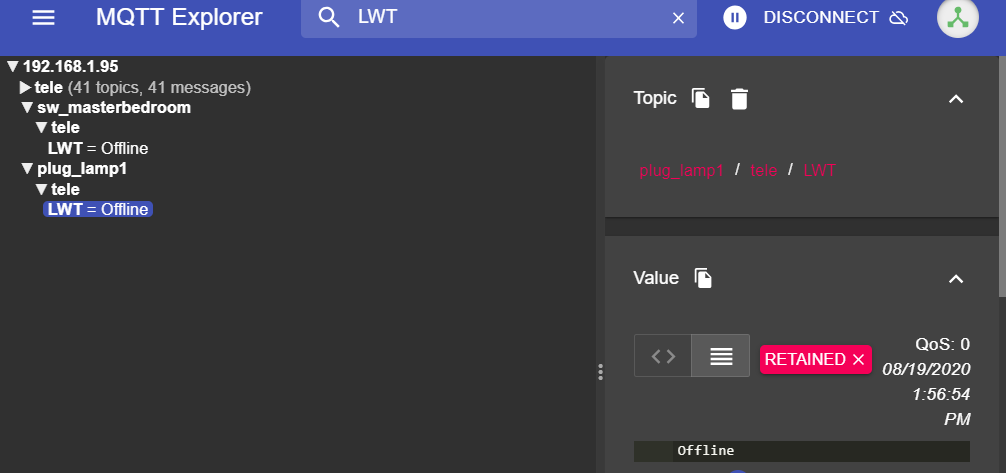 Take for instance a Tasmota device shown above. It has a retained message on plug_lamp1 as the MQTT broker dropped the Offline message after the Tasmota device fell from the network. This allows anything else that connects to MQTT such as HomeAssistant to see that the device is offline and not allow the user to interact with it. The stock Shelly firmware seems to be broken in this aspect.