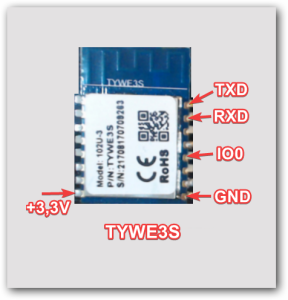 The TYWE3S module containing the flash-able ESP8266 chip is wide out in the open. There are multiple choices you can use to flash this chip with the 3v3 and GND headers. Using a TTL USB adapter, you need to connect the following wires: 3v3 (do not use 5 volts!), Ground, RX, and TX. GPIO 0 will also need to be attached to ground to enable flash mode on an ESP8266. Instead of soldering, if you have a 3D printer you can also make a pogo pin jig as shown here and below. Remember that RX goes TX and TX goes to RX on the USB TTL adapter.